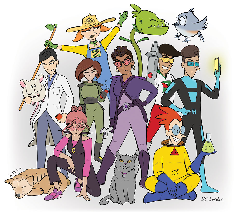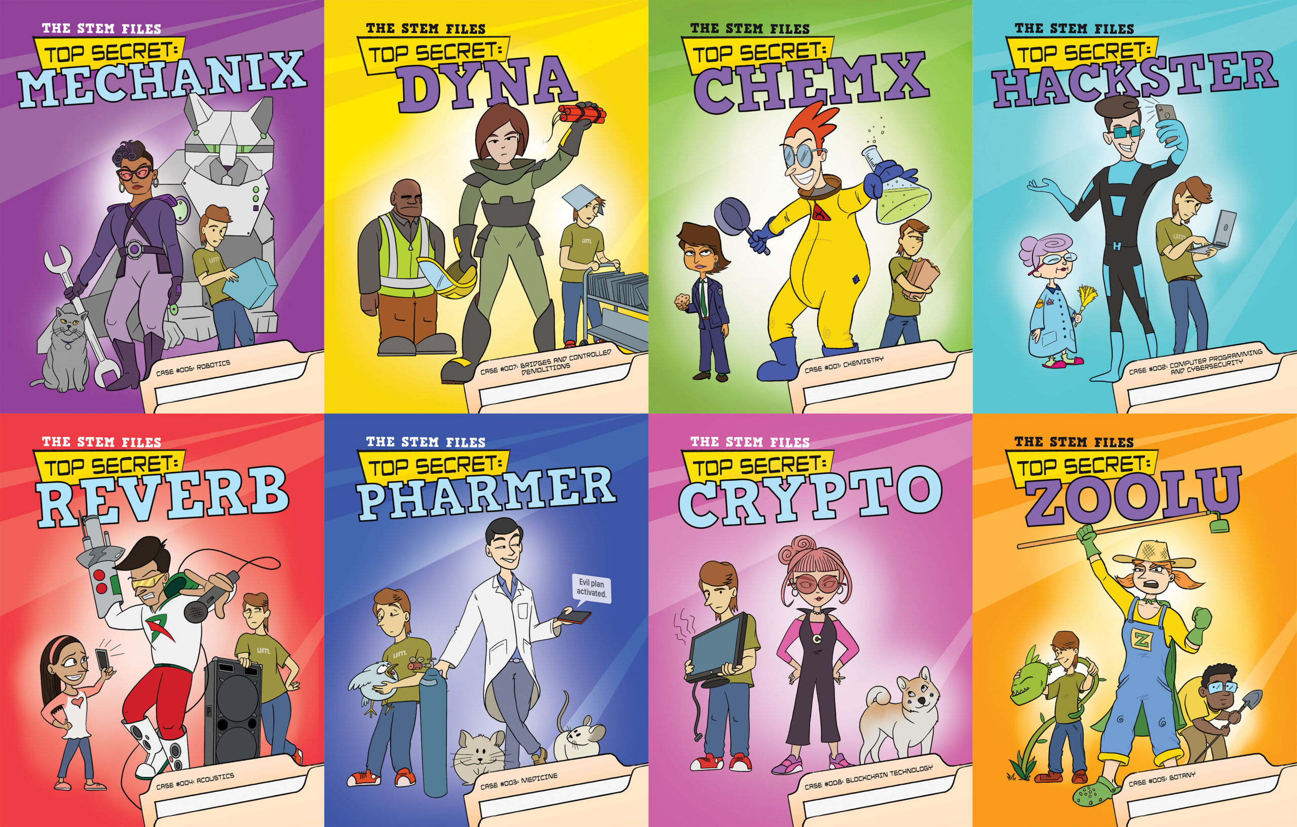 The STEM Files (Top Secret) book series consists of 8 graphic novels for children to teach elements of different STEM fields. The central theme of all of theme is simple: A wanna-be not-quite-evil villain is thwarted in their goals of domination, not by some caped crusader, but by their lack of STEM knowledge. The books were published by Torch Graphic Press, part of Cherry Lake Publishing Group.