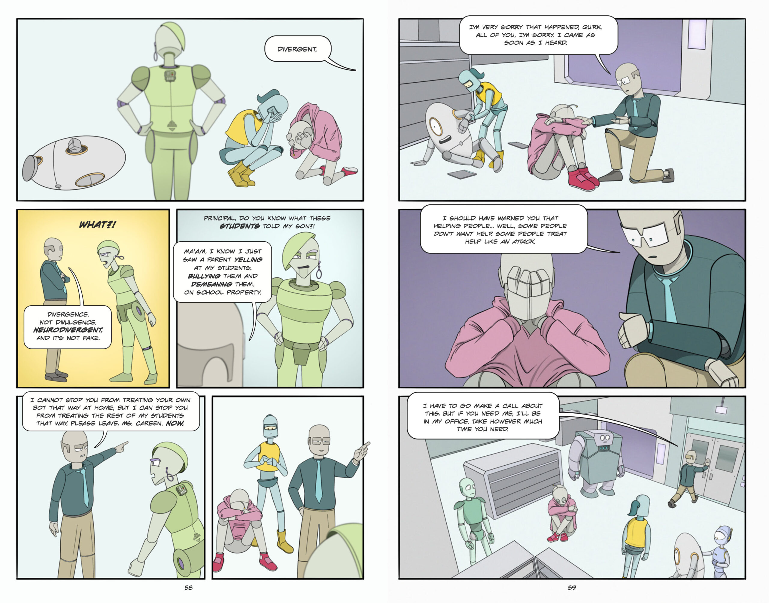 “Wired Different” is a graphic novel about neurodivergence, stigma, and self-advocacy. In a post-human robot society where psychology is forbidden, four neurodivergent students inadvertently form an advocacy club that becomes a lifeline for struggling teens. Stigma, grief, and conspiracy-fueled backlash force them to decide whether to stay silent or advocate for themselves.